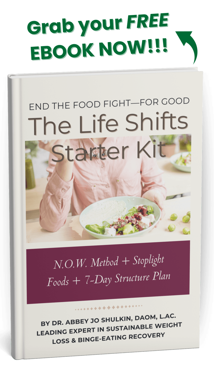 Dr. Abbey Jo Shulkin, DAOM, L.Ac., helps high-achieving women (25–55) end binge/emotional eating, body-image shame, and chronic diet cycles. Her Life Shifts Weight Wellness System is a multi-layered, addiction-informed approach that replaces willpower and restriction with brain-body tools, structure, and steady results you can maintain.